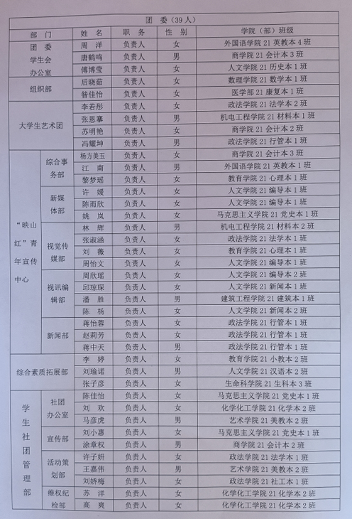 按照《共青团中央改革方案》等文件精神及开展2022年校团委学生会换届工作的有关要求,经团支部推荐、学院团委审核、学院党委同意、校党委学生工作部、校团委资格审查,经面试、笔试、考察等程序,拟定共青团井冈山大学委员会第十六届试用期工作人员名单。具体名单如下,现予以公示。