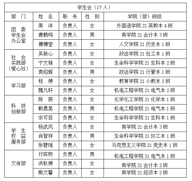 按照《关于推动高校学生会(研究生会)深化改革的若干意见》《井冈山大学学生会改革实施方案》和《中华全国学生联合会章程》等文件精神及开展2022年校团委学生会换届工作的有关要求,经团支部推荐、学院团委审核、学院党委同意、校党委学生工作部、校团委资格审查,经面试、笔试、考察等程序,拟定井冈山大学第十六届学生会工作人员名单。具体名单如下,现予以公示。